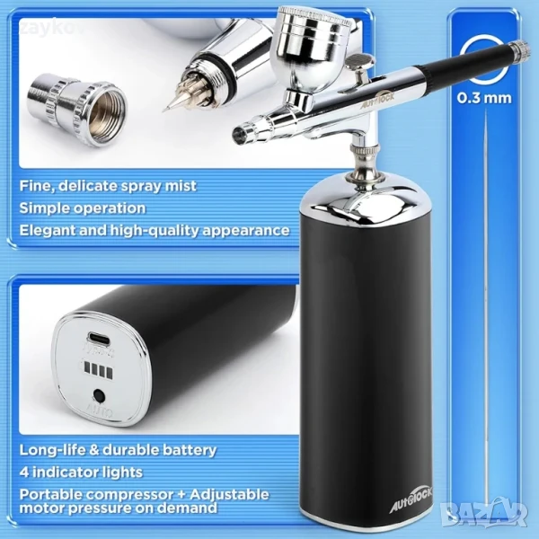 Нова структура и широка употреба: Елегантен външен вид, без отвори по тялото. Преносим и компактен размер, лесен за носене навсякъде. Най-ниското налягане е 20 PSI, което е много подходящо за грим с аерограф. Най-високото налягане от 30 PSI е предназначено за областта на рисуването с аерограф: художествено рисуване, декориране на торти, ноктопластика, занаяти, модели, илюстрации, временни татуировки, хобита и др. Можете да натиснете бутона "Auto" в долната част на въздушния компресор, за да регулирате силата на въздуха