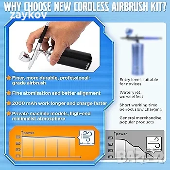 ПО-БЪРЗА ТЕХНОЛОГИЯ ЗА ЗАРЕЖДАНЕ И ПО-ДЪЛГО ВРЕМЕ ЗА РАБОТА: Пистолетът се предлага с кабел за зареждане Type-C и поради подобренията в схемата и батерията, поддържа технология за бързо зареждане 2A. Препоръчително е да го зареждате с DC 5V-2A зарядно за по-бърза скорост. След пълно зареждане, времето за работа може да достигне 1 час, докато други продукти могат да достигнат само 30-50 минути. Не се препоръчва използването на комплекта за аерограф по време на зареждане, нито пък се препоръчва използването на зарядно устройство с ток по-малък от 1A или по-висок от 2A.