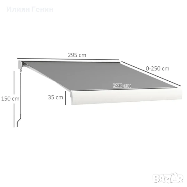 Площ за засенчване: 295Д x 250Ш см. Стената трябва да е с височина поне 280 см, за да може тентата да се монтира. При монтажа оставете 30 см разстояние над вратата и прозореца. Не е необходим монтаж на тентата.