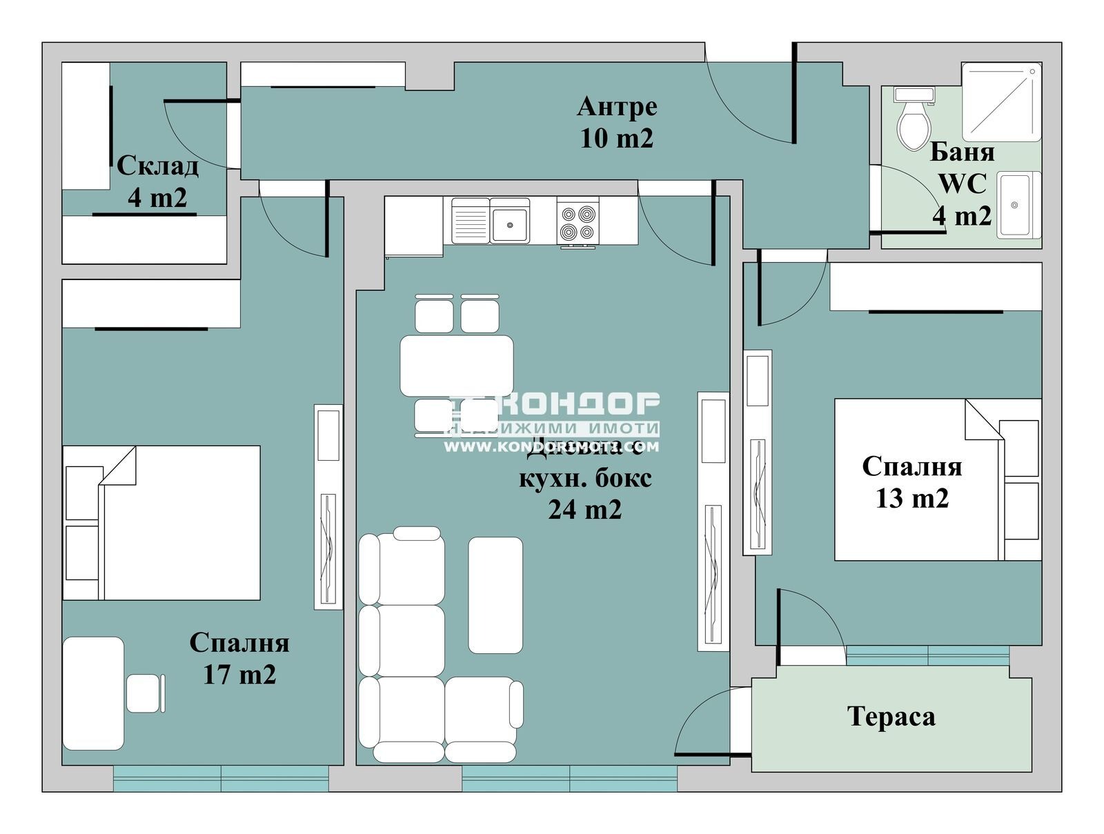Оферта 67256: Имаме удоволствието да Ви предложим новоизграденият ни проект, ситуиран в СГРАДА С АКТ 16 ,най-бързо развиващия се квартал на града - Тракия. Функционален тристаен апартамент с изложение ЮГ/ИЗТОК, състоящ се от дневна с трапезария и кухненски бокс - 24 м2, родителска спалня - 17 м2, детска стая - 13 м2, баня с тоалетна, помещение тип килер, входно антре - 10 м2 и една тераса.