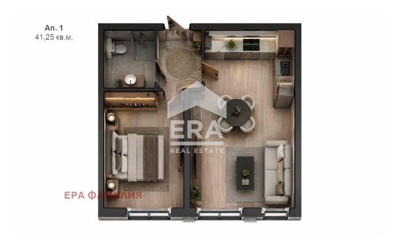 - Разпределение: Антре, дневна с трапезария и кухненска част, спалня, баня с тоалетна.