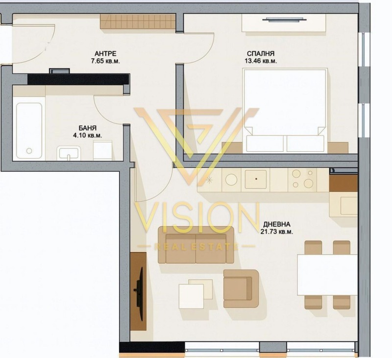 VISION Real Estate Ви представя двустаен апартамент с обща площ от 67.57 кв.м., който се състои от: антре, дневен тракт, спалня, санитарно помещение в нова бутикова сграда от висок клас, разположена в един от най-предпочитаните райони на София кв. Симеоново.