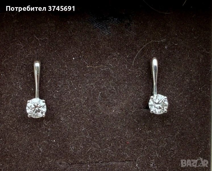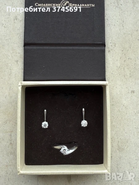 Съветски Диамантени обеци и пръстен – 18К бяло злато, естествени диаманти, със сертификат → Обява 50846244