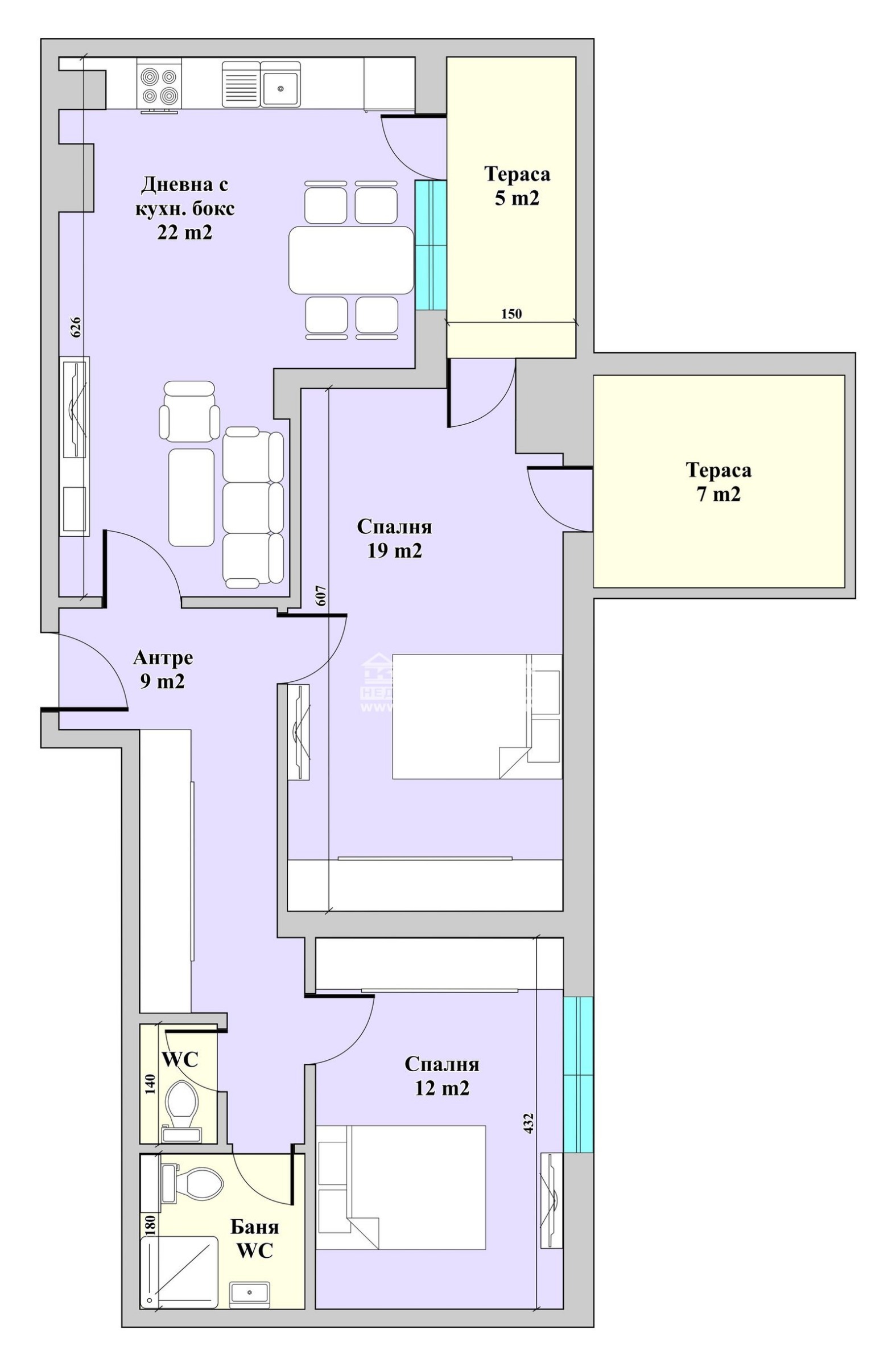 Разпределения - Предлагаме на Вашето внимание функционален тристаен апартамент, състоящ се от дневна с трапезария и кухненски бокс, просторна родителска спалня - 19 м2, с място за голям гардероб, детска спалня, баня с тоалетна, втора тоалетна, две тераси и входно антре.