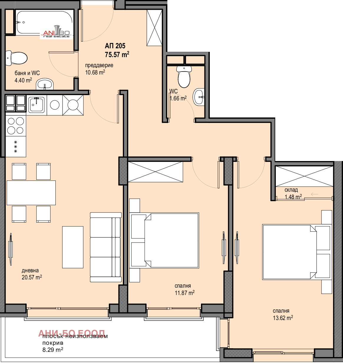 Входно предверие, дневна с кухненски бокс, две спални, две бани с тоалетна, склад. Светли площи, големи прозорци, изложение на Югозапад.