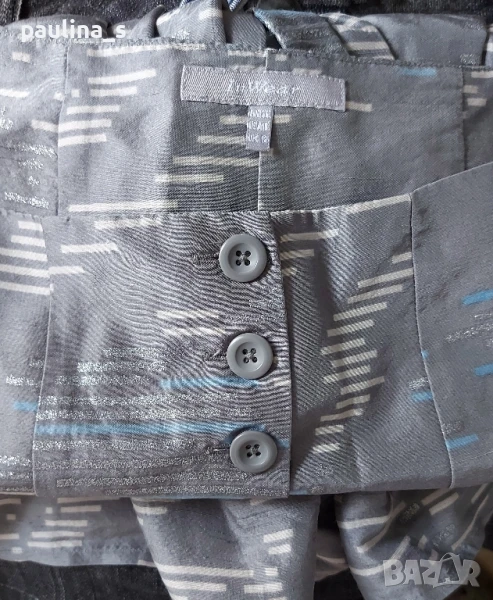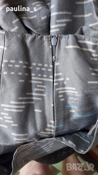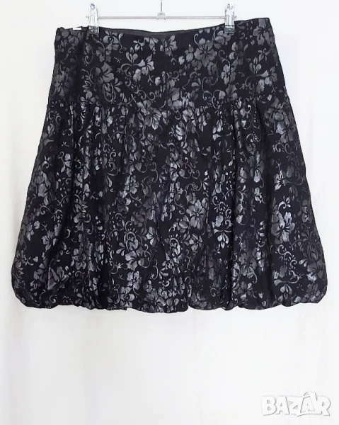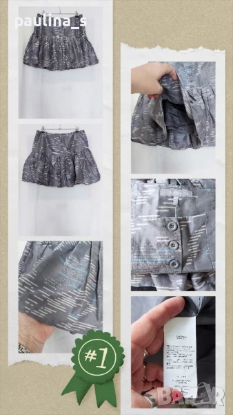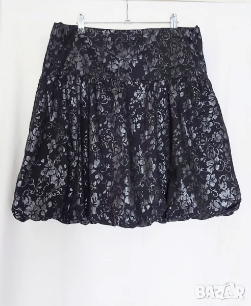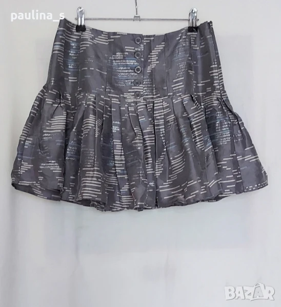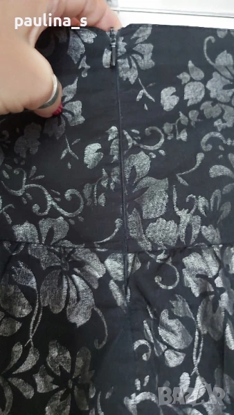 1️⃣. Колаж / M / L - "in wear". Цената е крайна 24,99лв / 12,5 евро. Винтидж! Луксозна пола от копринен сатениран плат със сребристи щампи, бутик селекция. Моделът отгоре е с подплатена платка, скрит цип и копчета. Закопчаването е с цип в ляво, наборът започва от нивото на ханша, богато разкроен и шармантен. Полата е с хастар! Платът е 100%