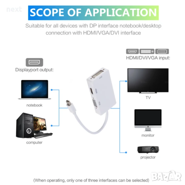 Преходник, адаптер, преобразувател mini DisplayPort (mini DP) към HDMI DVI VGA + Гаранция