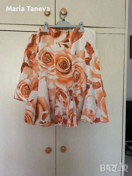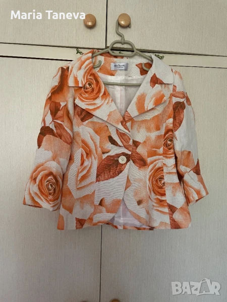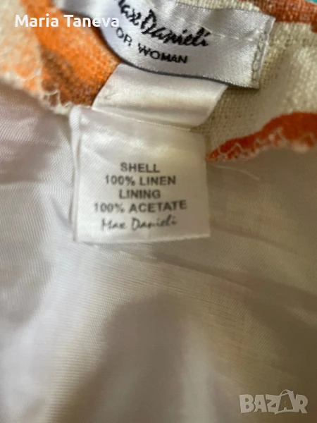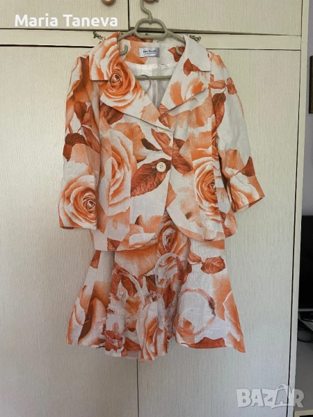 Ленен костюм в две части-пола, с дължина 63 см, обиколка в талията 80 см и обиколка в ханша 98 см и сако с дължина 51 см, разстояние между раменете 35 см, разстояние подмишниците (от шев до шев) 43 см. Полата и сакото са с подплата. Обличан е два пъти.