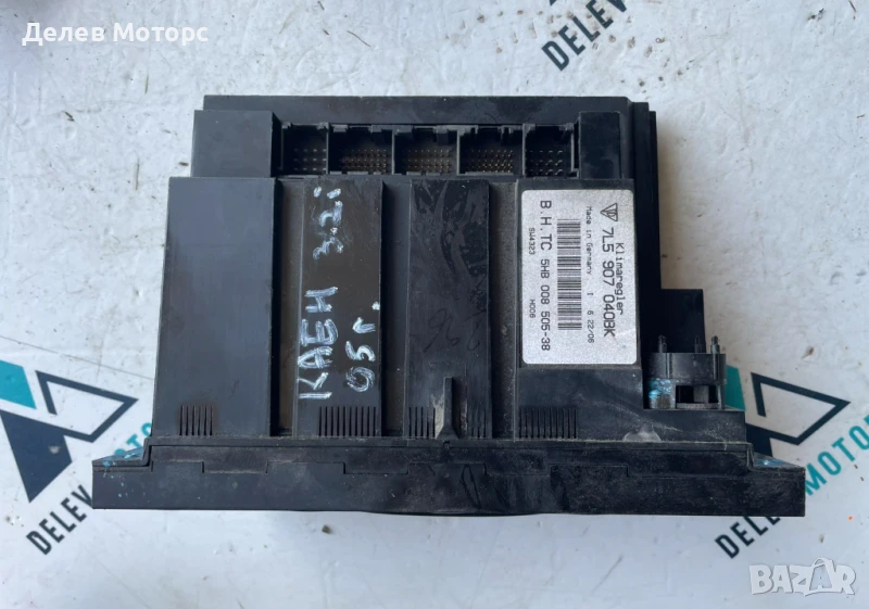за климатроник 7L5907040 от Порше Каен Porsche Cayenne 4.5I, 340 к.с 2005г. в автоморга Delev Motors, между с. Каменар и с.Куманово гр. Варна. ВСИЧКИ ЦЕНИ СА С ВКЛЮЧЕНО ДДС. ВСИЧКИ ЧАСТИ СА С 14 ДНИ ПРАВО НА ВРЪЩАНЕ. Изпращане на части чрез наложен платеж с ЕКОНТ с 30% отстъпка от куриерските услуги за цялата страна, получаване на следващият ден. Доставката и връщането е за сметка на КУПУВАЧА. Изкупуване на западни и японски автомобили, джипове и бусове след 2020 г. за части. Издаване на удостоверение за бракуване пред КАТ. Издаване на всички необходими документи за регистърация на двигател в КАТ. РАБОТНО ВРЕМЕ ОТ ПОНЕДЕЛНИК ДО ПЕТЪК от 9.00 ч. до 18.00 ч., ПОЧИВНИ ДНИ СЪБОТА И НЕДЕЛЯ. За контакти: 0897852371