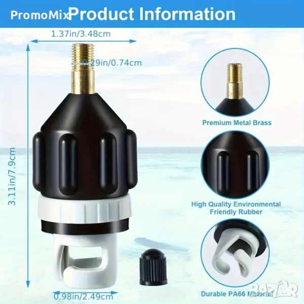 Адаптера е изработен от здрава ABS пластмаса с клапан за високо налягане, който осигурява надеждно уплътнение и предотвратява изпускане на въздух.
