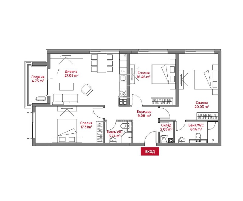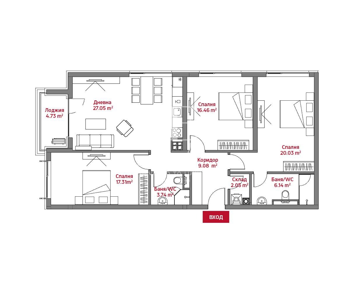 Жилището разполага с три просторни стаи, светъл и функционален хол с кухненски бокс, две модерни бани, складово помещение, коридор и тераса, идеална за релаксация. Ref. ID:25409