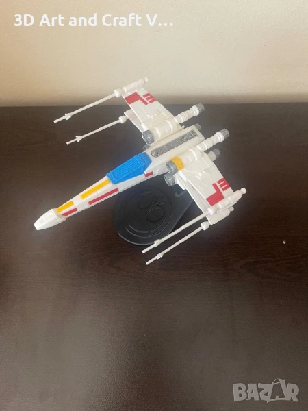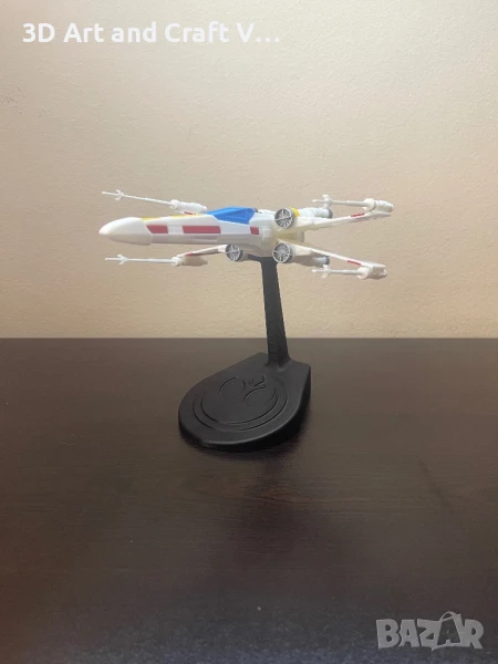 Колекционерски модел на X-Wing изтребител от вселената на Star Wars, поставен на декоративна стойка с емблемата на Бунтовническия съюз. Подходящ за фенове, колекционери или като стилен декор за бюро или етажерка.