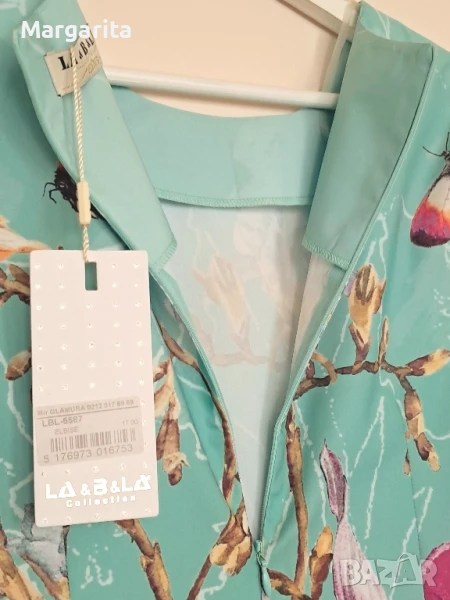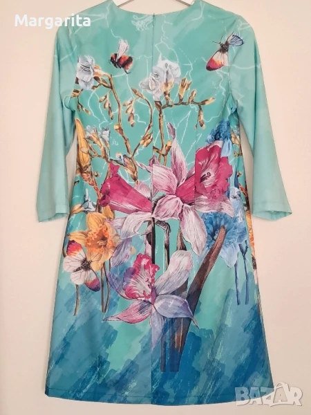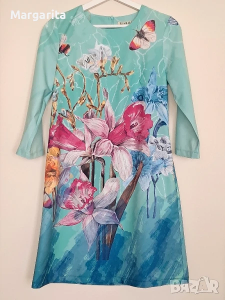 Нова флорална рокля в размер 38/М. Размери гръдна 43см, рамене 36см, ханш 47см., дължина 85см. Има два странични джоба. Закопчава се със скрит цип. 80% памук, 5% еластан.
