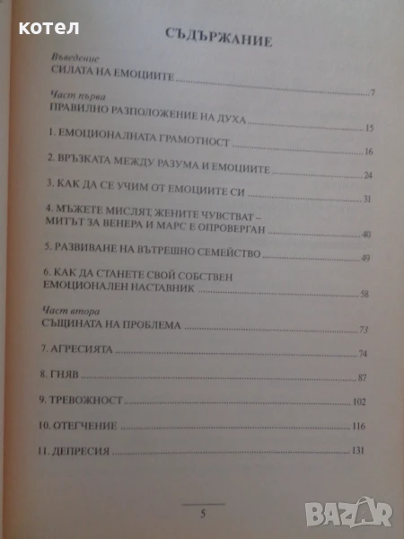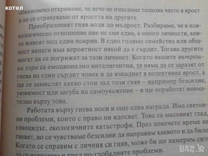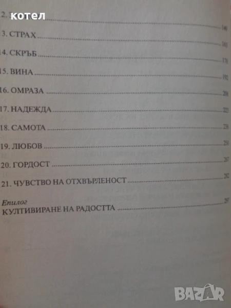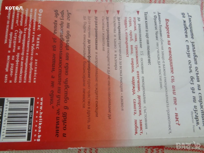 „Емоциите запалват огъня на страстите - да живеем с този огън, без да ни изгаря." /Франсис Уилкс/ Владеем ли емоциите си, или те - нас? Даниел Голман обясни защо е важна емоционалната грамотност, а Франсис Уилкс ни учи как да я постигаме. Тази книга ще ни помогне: - да разпознаваме 15 основни емоционални състояния - агресия, гняв, тревожност, отегчение, депресия, завист, страх, скръб, вина, омраза, надежда, самота, любов, гордост, отхвърленост; - да откриваме причината за всяка емоция - какво я отключва и какво я възпира; - да контролираме емоциите и да не им позвоаляваме да съсипват живота ни; - да разграничаваме и направляваме чуждите емоции - да се научим да трансформираме едно чувство в друго, за да бъдем емоционално балансирани личности; Фансис Уилкс е английски психотерапевт и учен. Работи по проблемите на самоусъвършенстването и емоционалната грамотност. Тя е координатор на английската асоциация „Форум за професионално развитие". Сътрудничи на радио и телевизионни програми и вестници като експерт по психология.