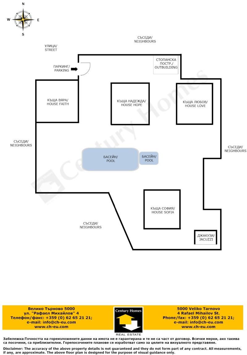Комплексът се състои от четири напълно идентични къщи, всяка със застроена площ от 130 кв.м., или общо 520 кв.м., разположени върху озеленен и прецизно поддържан парцел от 2 200 кв.м. Всяка къща е ориентирана на юг, което гарантира светлина и топлина през по-голямата част от деня. Всяка от тях разполага с уютна веранда с директен излаз от трапезарията, както и със самостоятелна барбекю зона идеалното място за споделени моменти с приятели и гости под открито небе.