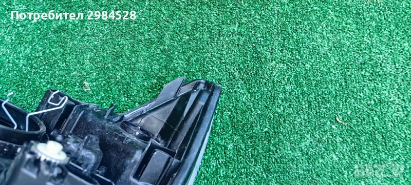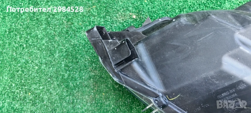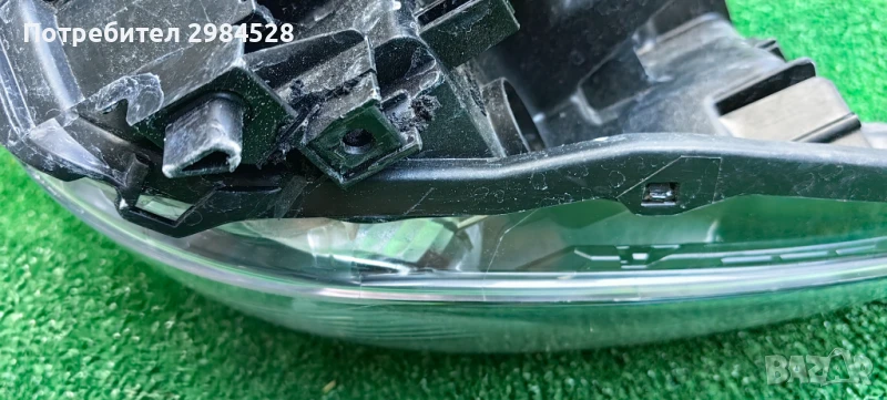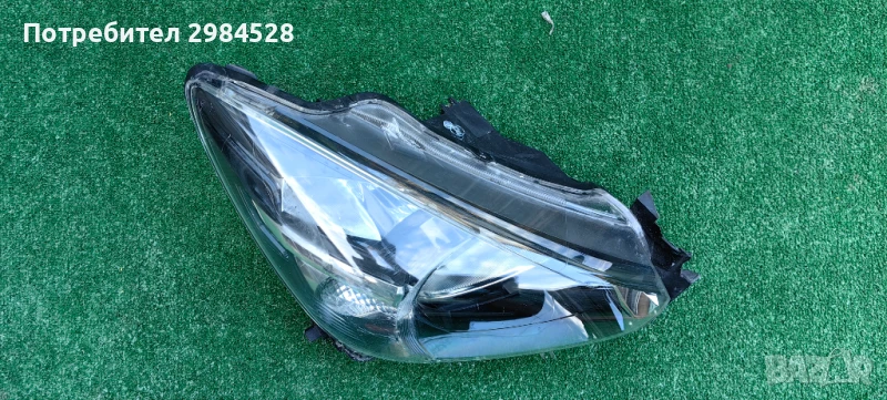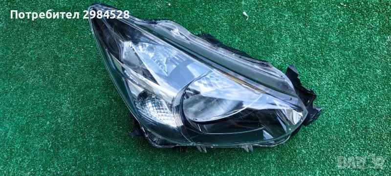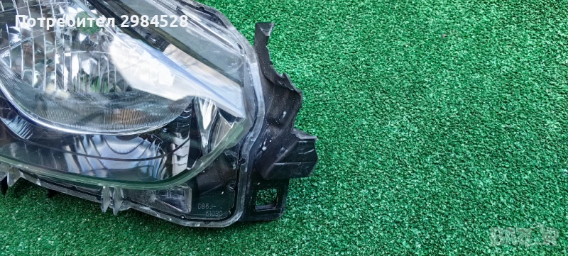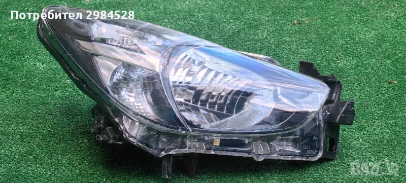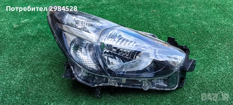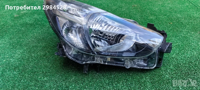 Оригинален десен фар за Mazda 2 - С рефлектор и халогенна крушка, забележки по захватите - здрав долен, половината от този към предната решетка, счупен от към калника.