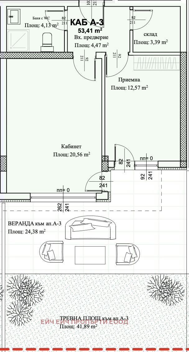 Просторна веранда (24,38 кв.м) и тревна площ (41,89 кв.м) идеални за зона за отдих, детски кът или зелено пространство за спокойствие