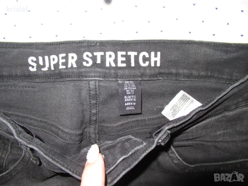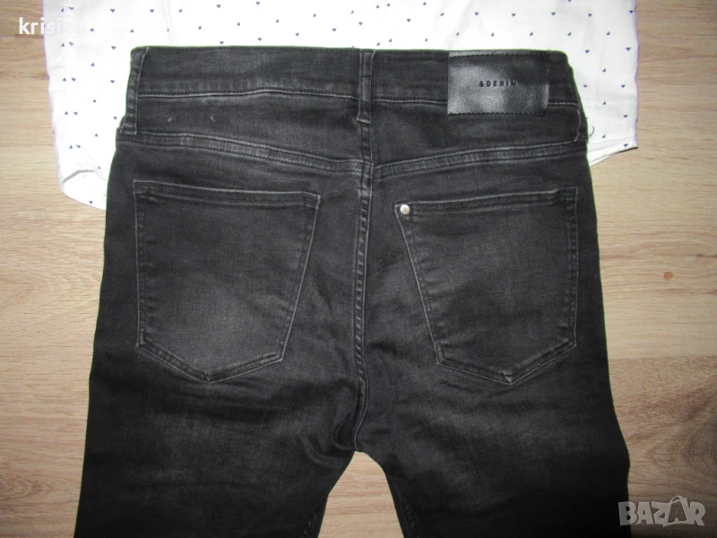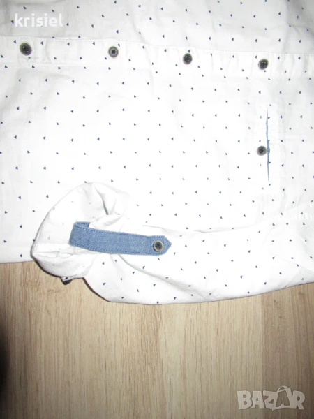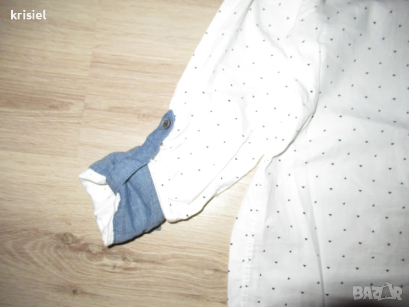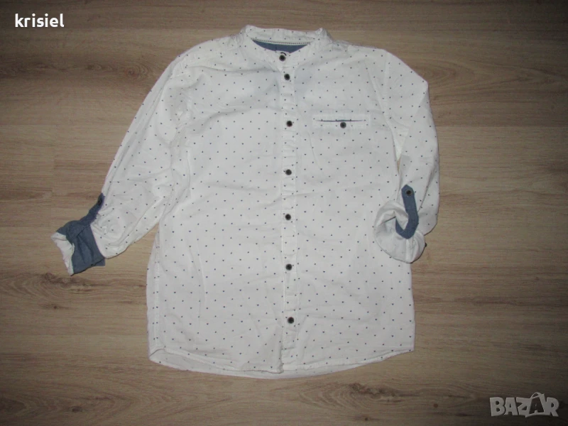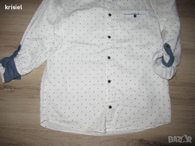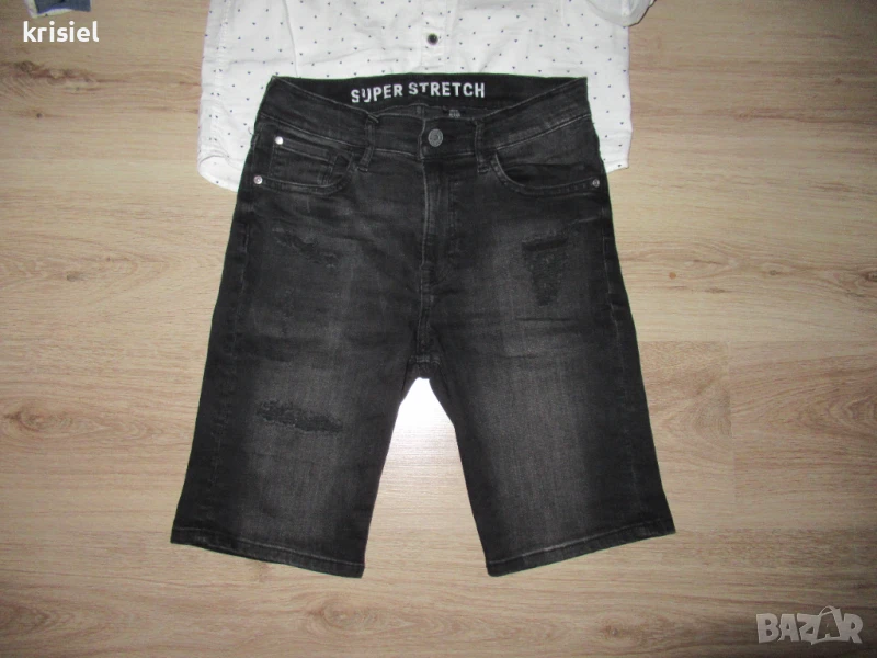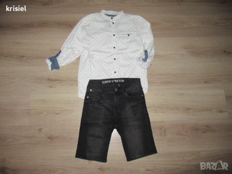 Комплекта е неразличим от нов.Обличан два пъти.Номер 158.Меки и супер удобни еластични дънки.Памучна риза,на която ръкавчето става късо.