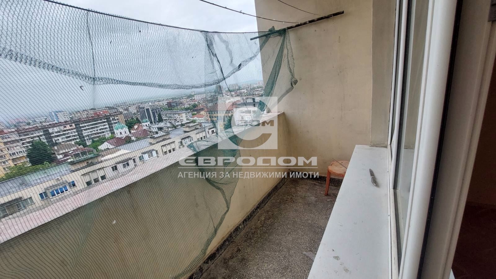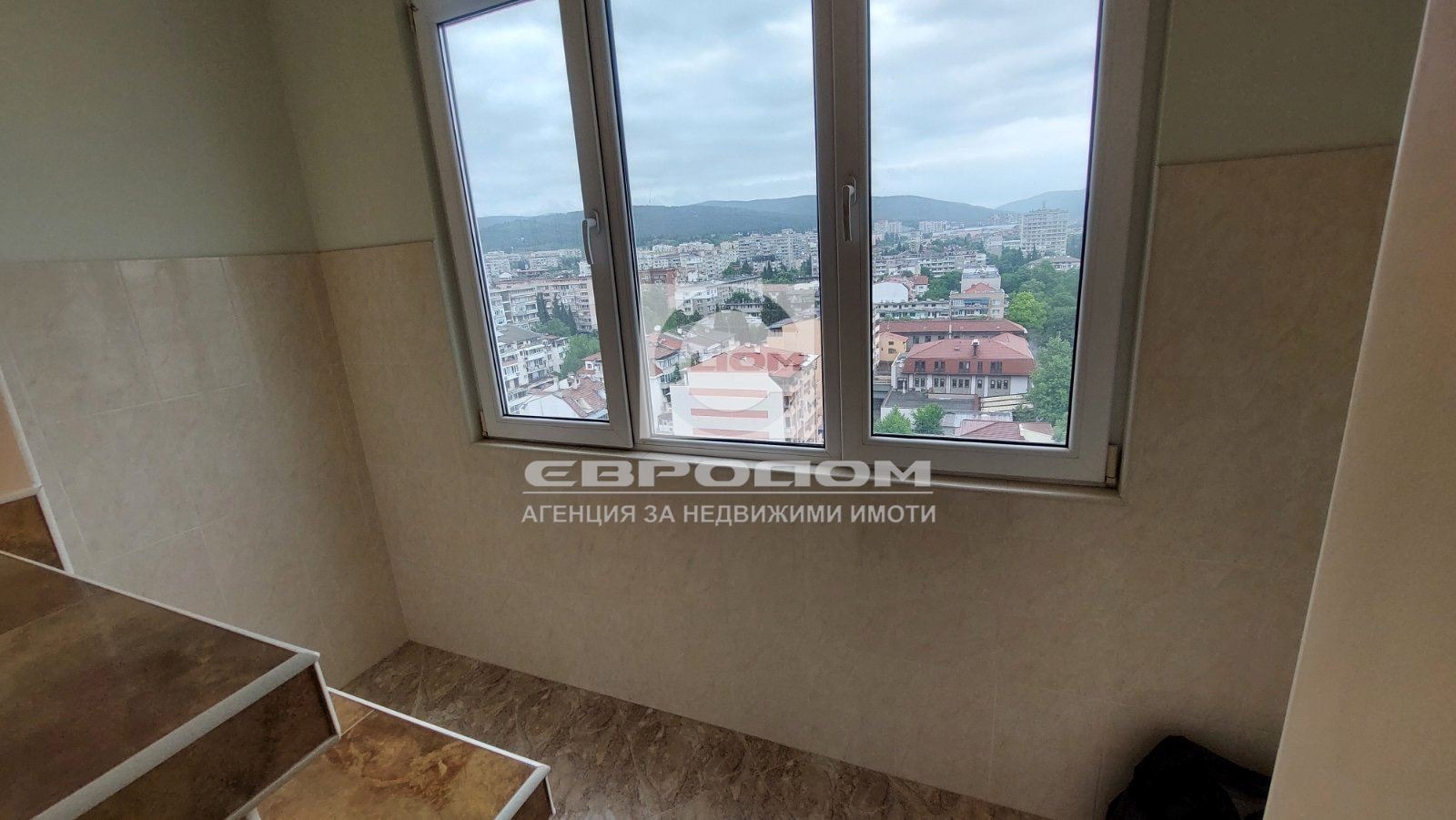 Продавам панорамен монолитен апартамент с чиста жилищна площ ( ЧЖП ) 90 в.м.; в района на търговската гимназия. Разположен е на 12 последен етаж под плътни тавански стаи и е с изложение север - юг. Площта е разпределена по следния начин: г - образен коридор; дневна с бокс / с усвоена тераса, изградена с тухли и изолация, включително и на пода / на север; самостоятелна спалня / с усвоена тераса, изградена с тухли и изолация, включително и на пода / на север; хол с тераса на юг; преходна спалня от хола на север; баня с мокро помещение и отделна тоалетна. Жилището е отремонтирано и готово за обзавеждане. Настилките са естествен паркет, теракот и ламиниран паркет. Дограмата е изцяло сменена. Интериорните и масивната входната врата са нови. Към апартамента има прилежащи таванско и избено помещение. Цената подлежи на коментар!