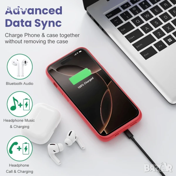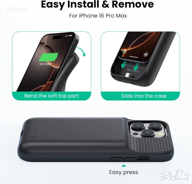 Специално проектиран за iPhone 16 Pro Max (6.9"), този калъф с батерия 8600mAh предлага до 200% по-дълъг живот на батерията и включва USB-C порт, но не поддържа безжично зареждане или кабелни слушалки. Той осигурява пълна защита на устройството с повдигнати рамки и протектор за екран от закалено стъкло, а сертифицираните функции за безопасност предпазват от прегряване и презареждане. Усъвършенстваната технология за синхронизиране позволява едновременно зареждане и синхронизиране на данни без да се сваля калъфът, а Bluetooth слушалките остават използваеми. Инсталацията е бърза с мек TPU капак, а LED индикаторите показват нивата на батерията. Комплектът включва калъф, протектор за екран и ръководство.