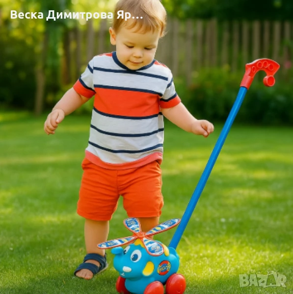 Забавна и цветна детска играчка с дръжка за бутане – идеална за деца в ранна възраст. Играчката е оформена като самолет или слонче и е предназначена да насърчава движението и активната игра. Подходяща за използване както на закрито, така и на открито.