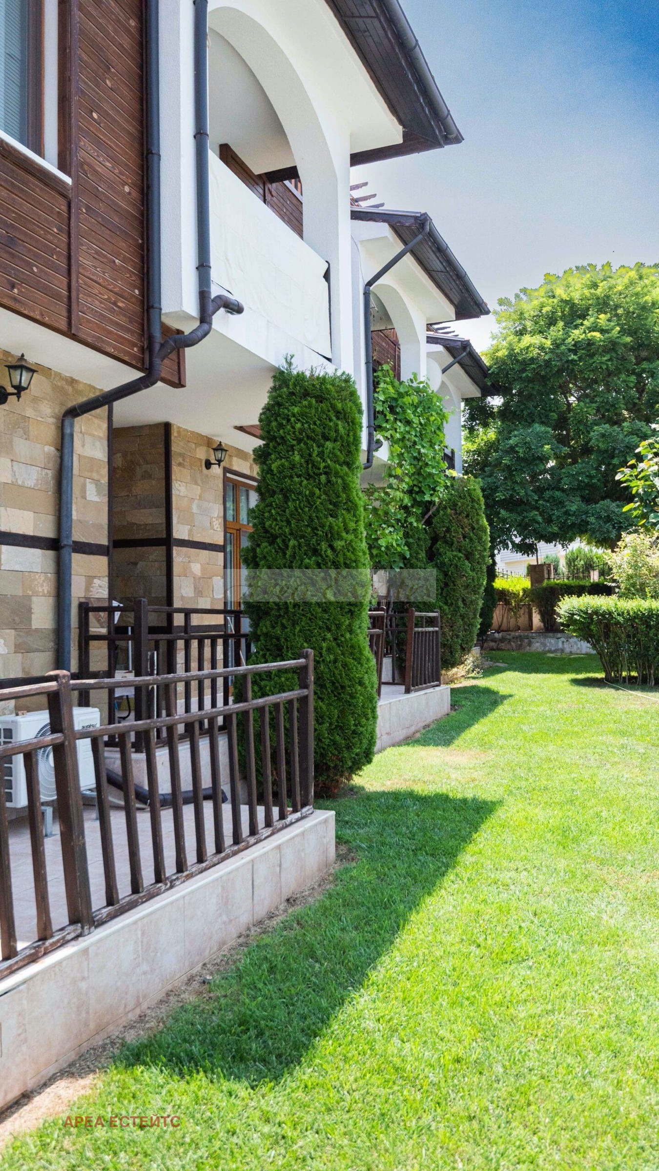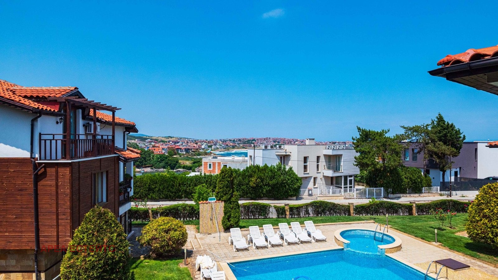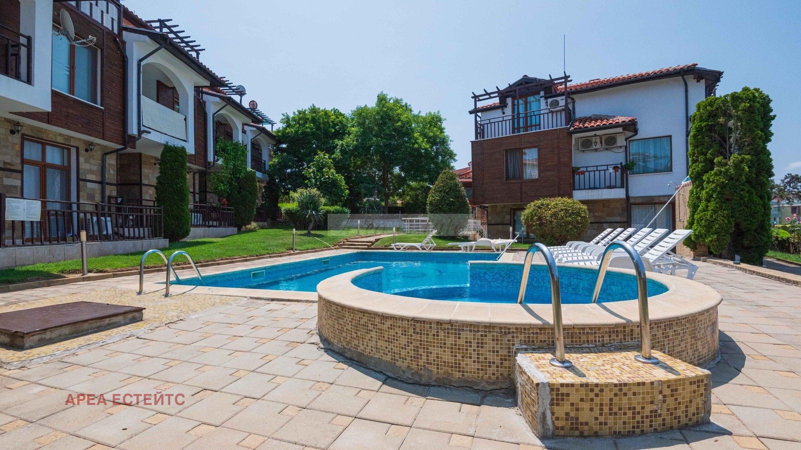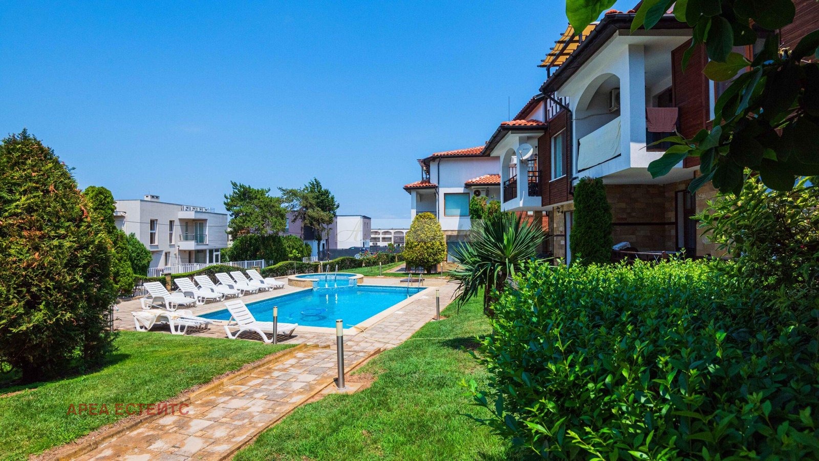 Комплексът разполага с басейн, красиво озеленени площи и контролиран достъп.