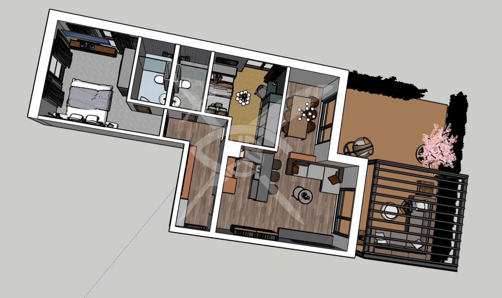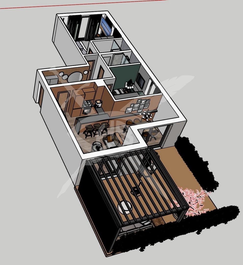 РАЗПРЕДЕЛЕНИЕ: Имотът разполага с площ от 104 кв.м., разпределена във яходно антре, дневна с кухненски бокс, спалня, спалня с баня и тоалетна, отделна баня с тоалетна, коридор и двор.