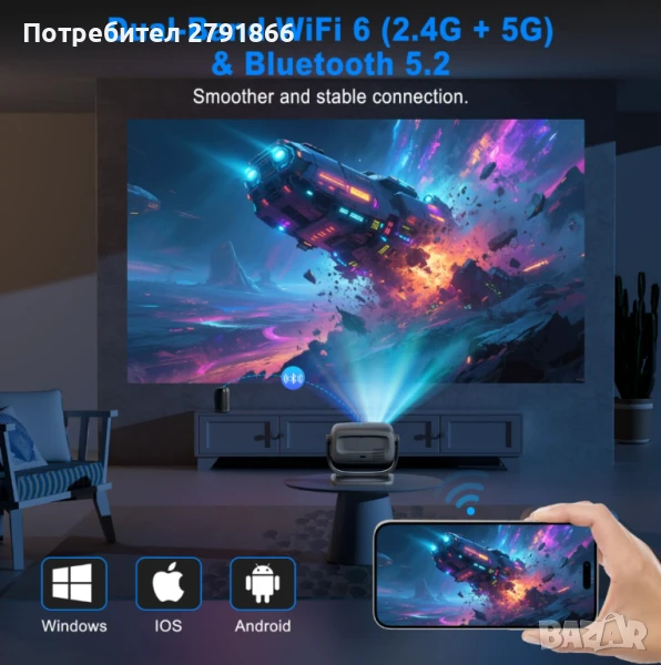 Прехвърляне на екрана: Ако използвате функцията за прехвърляне на екрана на телефона, за да гледате филми, можете едновременно да изпълнявате и други задачи, например да отговаряте на имейли или чатове, като показването на филма, възпроизвеждан от проектора, не се влияе.