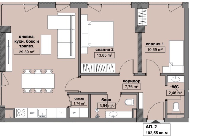 Представяме Ви 3- стаен апартамент, на 4ти от 7 етажа, със следното функционално разпределение: входно антре, просторна всекидневна с кухненски бокс, две спални, баня с тоалетна, отделна тоалетна и складово (мокро) помещение. Жилището се намира в луксозна многофункционална сграда, в широкия център на София, с модерна архитектура и премиум удобства!