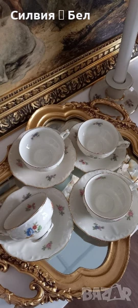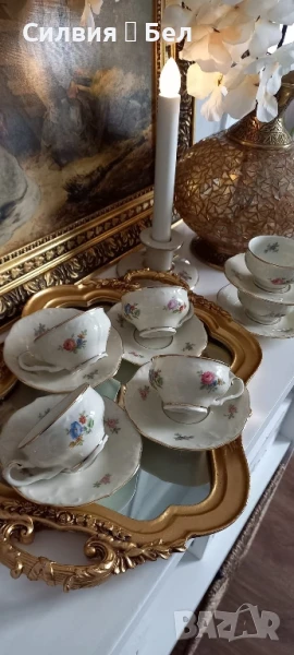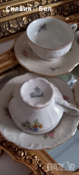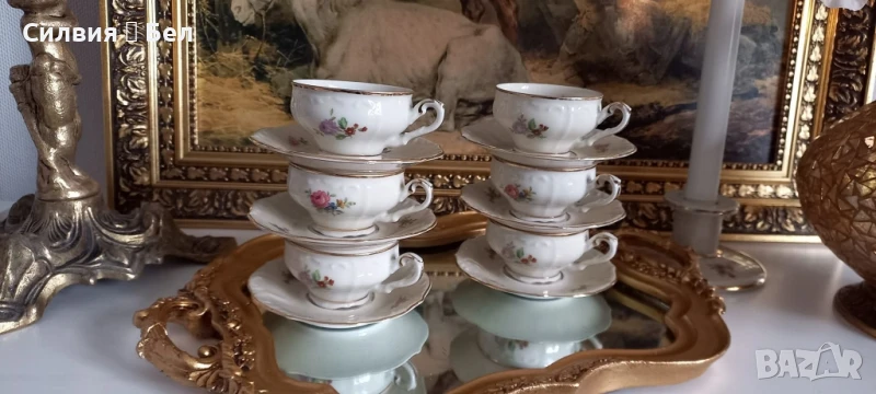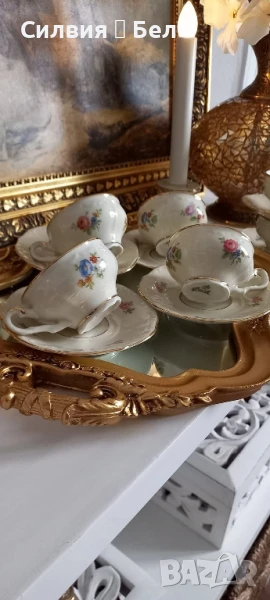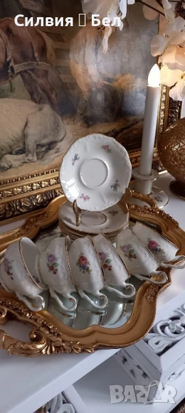 1930г. Heinrich Winterling \"Barock\" Coffee6️⃣ Мока чаши за кафе с чинийки. Вместимост 70мл.Диаметър чинийка- 10,2см.Стар сервиз в слонова кост, обсипан с дребни цветя, златен кант и бароков релеф ⚘️Красота⚘️Цена 1️⃣8️⃣0️⃣лв.🌹..•´¨) ¸.•¨)🌱... (¸.•¨¯`*•.🍃🌹🍃Потопете се в атмосферата на едно отминало време с този изящен комплект, създаден от немска фабрика за