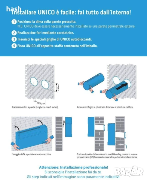 Климатикът няма външно тяло, това улеснява монтажа му. Можете да го монтирате на всяка външна стена, във всеки ъгъл, в зависимост от вашите предпочитания и дизайн.