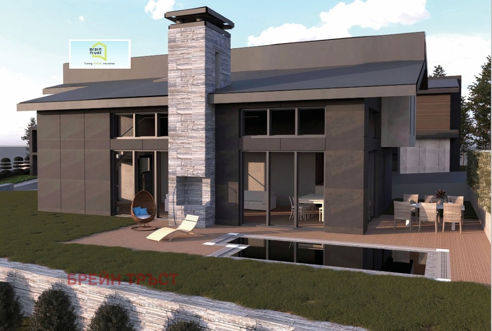 Къщата предлага просторна дневна с камина и панорамни прозорци, 3 спални със собствени бани, склад и ски гардероб, санитарно помещение за гости, двоен гараж и собствено дворно пространство от 988.96 кв.м, както и самостоятелен басейн с минерална вода.