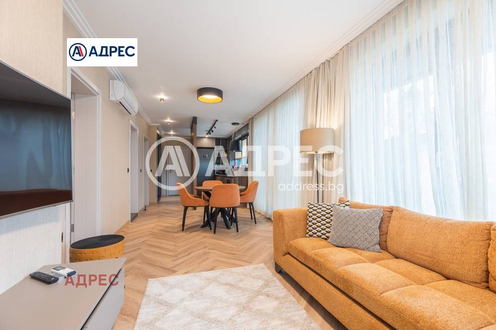 Всички помещения са с висок клас ламиниран паркет, а интериорните врати са с магнитни брави. Луксозен апаратамент, обзаведен с дизайнерски мебели по поръчка.