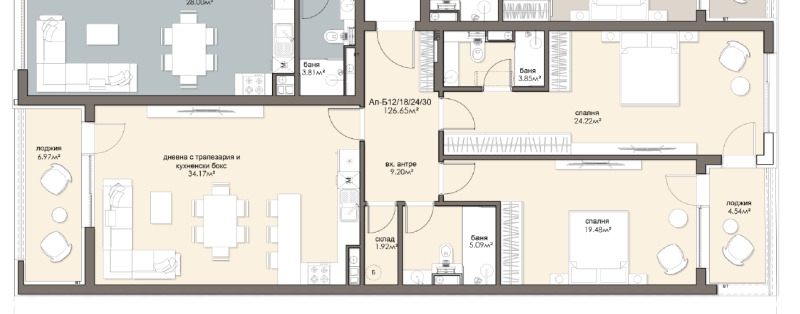 Апартаменти от този тип в продажба:Б36 ет.7 цена 247486Е; Б42 ет.8 цена 244468,20Е