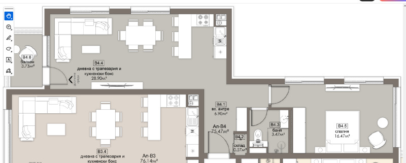 Просторен светъл и уютен двустаен апартамент, отговарящ на всички изисквания за един съвременен дом. Апартамент В4 на схемата. Удобно и функционално разпределение, големи, комфортни и светли помещения. Чиста площ 75,47кв.м., площ с общи части 86,23кв.м. Възможност за пълноценно и безкомпромисно обзавеждане на всички помещения.