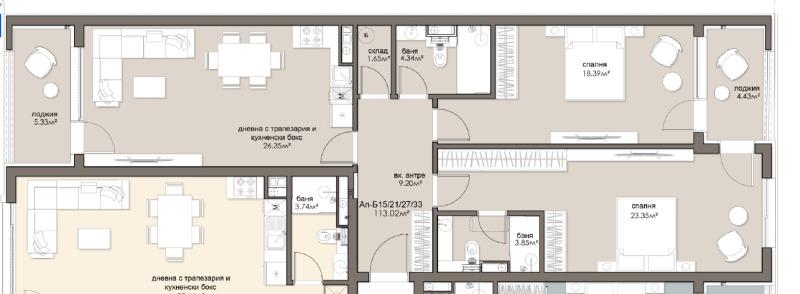 Просторен светъл и уютен тристаен апартамент, отговарящ на всички изисквания за един съвременен дом. Апартамент Б15 на схемата. Удобно и функционално разпределение, големи, комфортни и светли помещения. Чиста площ 113,02кв.м., площ с общи части 129,91кв.м. Възможност за пълноценно и безкомпромисно обзавеждане на всички помещения.
