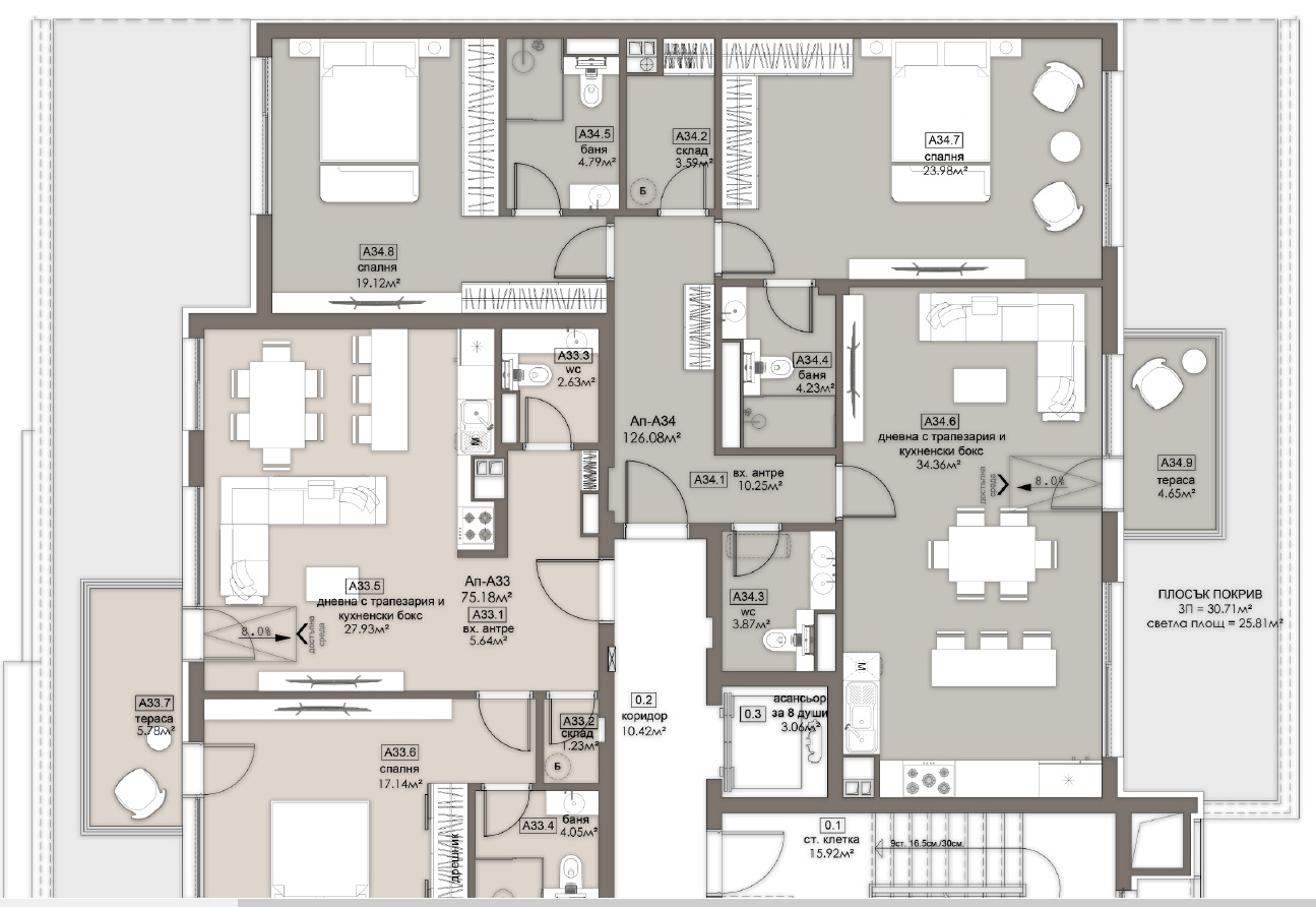 Просторен светъл и уютен тристаен апартамент, отговарящ на всички изисквания за един съвременен дом. Апартамент А34 на схемата. Удобно и функционално разпределение, големи, комфортни и светли помещения. Чиста площ 126,08кв.м., площ с общи части 143,81кв.м. Възможност за пълноценно и безкомпромисно обзавеждане на всички помещения.
