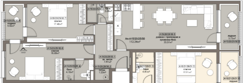 Просторен светъл и уютен 336стаен апартамент, отговарящ на всички изисквания за един съвременен дом. Апартамент А30 на схемата. Удобно и функционално разпределение, големи, комфортни и светли помещения. Чиста площ 112,34кв.м., площ с общи части 128,84кв.м. Възможност за пълноценно и безкомпромисно обзавеждане на всички помещения.