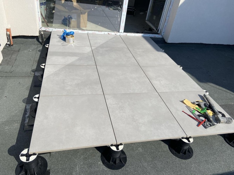 - тераса, завършена с двоен повдигнат под на пиедестали, обикаляща целия апартамент, 2 см плочки 60/60см и стъклен алуминиев парапет с двойно стъкло.