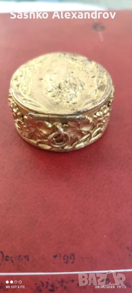 Кръгла , ръчно изработена , уникална , без аналог в нета . Много красива френска кутийка с 23 - 24 каратова позлата - Omorlu техника / огнено позлатяване върху бронзова основа /за енфие от началото на 20 - и век / около 1900 година / , подписана от френския художник и дизайнер P. de Bryk .