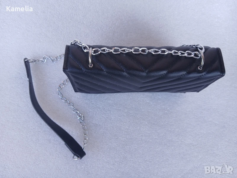 Дамска черна чанта, с дълга синджирена дръжка, за носене през рамо. С 2 клипс копчета. Като нова е.