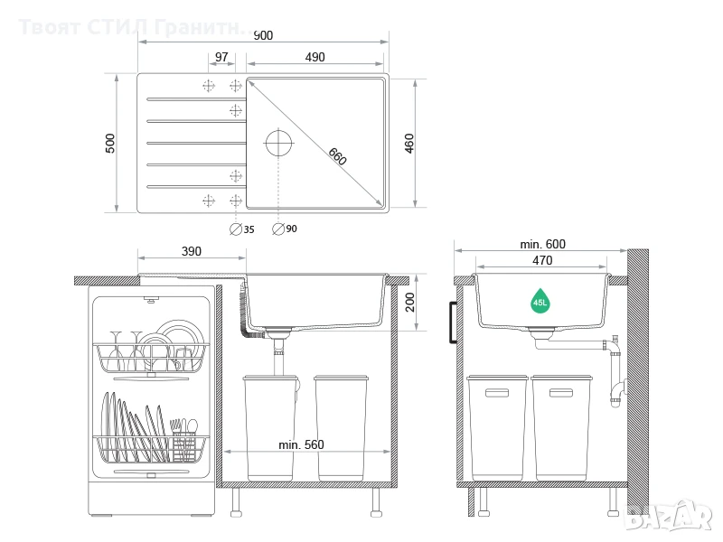 Зелената линия показва необходимото пространство в мм за монтаж на мивката в шкафа !!!