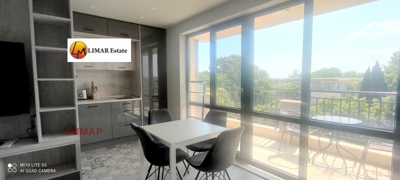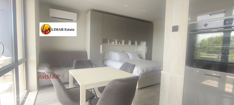 Жилището се състой от една стая, която е с кухненска част / кухненски шкафове, керамични котлони, ширм, фурна, съдомиялна и хладилник /, спалня, маса за хранене, разтегателен диван, телевизор. Баня и тоалет в едно. Тераса с масичка и столове. Обзавеждането е ново !