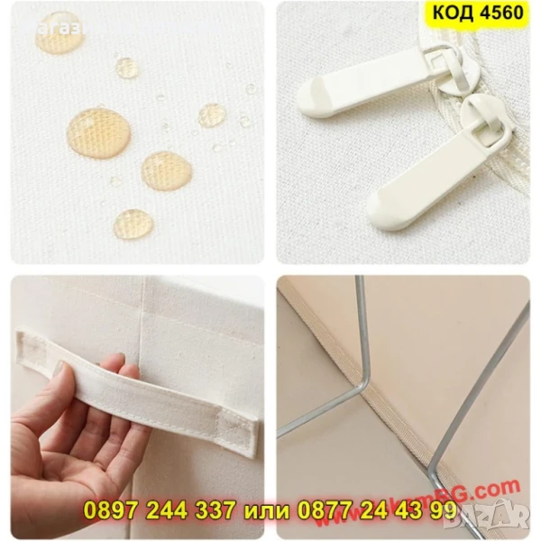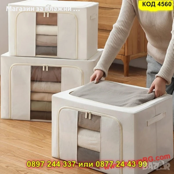 Стилна и практична кутия за съхранение на дрехи, завивки и спално бельо. Изработена от дишаща комбинация лен + памук и подсилена с метална рамка за стабилност. Подходяща за гардероб, килер или под легло.