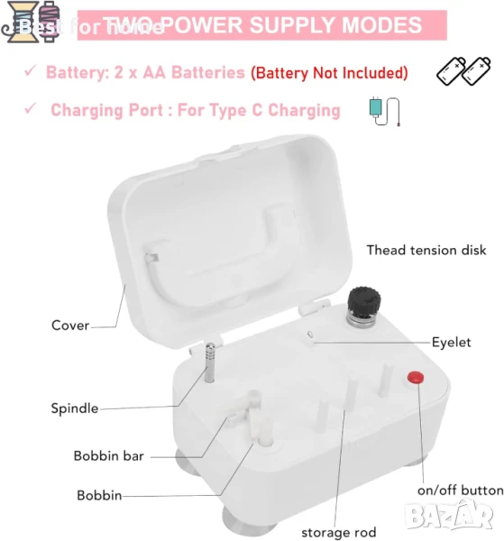 2+2 ФОРМА: Устройството за навиване на калерчета използва две структури за фиксиране на калерчетата + два режима на захранване, които могат да се адаптират не само към калерчетата на обикновени домакински шевни машини, но и към навиването на калерчетата на промишлени шевни машини. В същото време, за да се улесни ежедневната употреба, използваме AA батерии за захранване и поддържаме зареждане чрез порт за зареждане тип C, независимо дали е на открито или на закрито, така че не е нужно да се притеснявате, че няма да можете да го използвате.