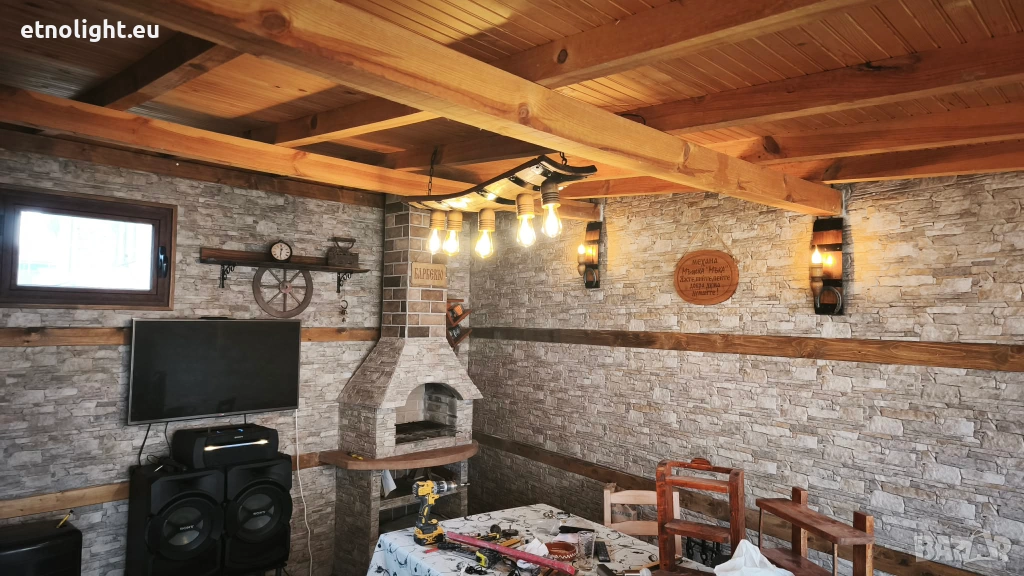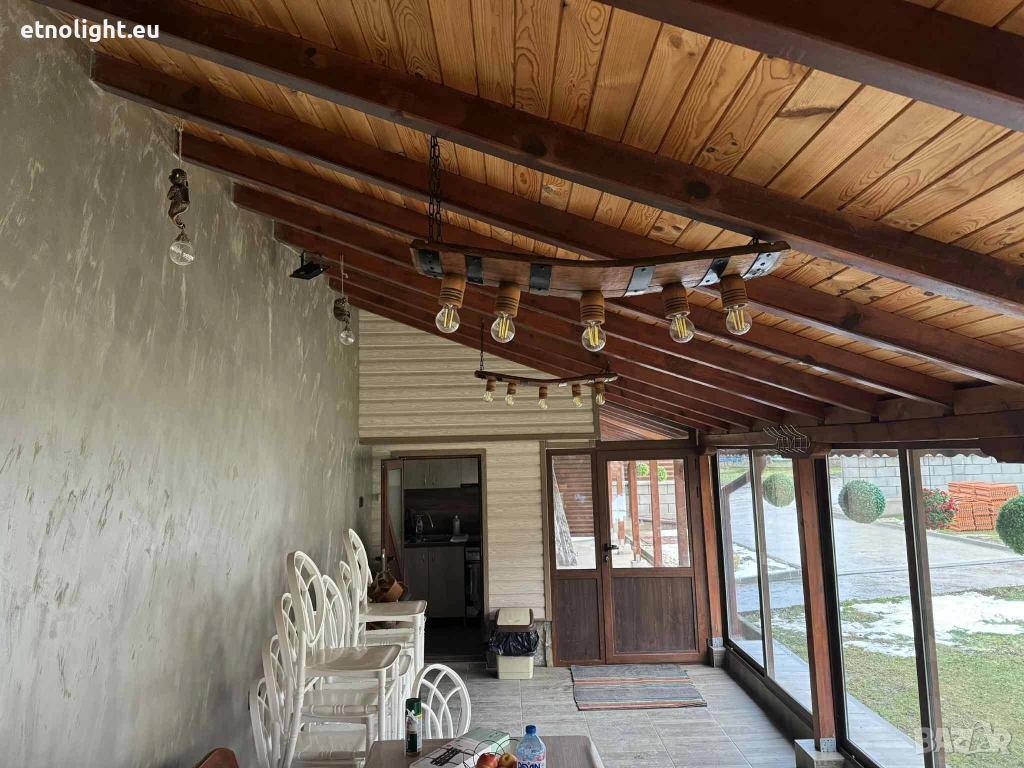 Изработваме битово осветление и декорация от автентични реставрирани бъчви и колела от каруца, този модел е с 5 ръчно изработени дървени чашки, фасунгите са Е 27 стандартни, със синджири, цвят и фасунга по избор, дължина 90 см, със синджири или за директен монтаж на тавана , разгледайте всички обяви мои