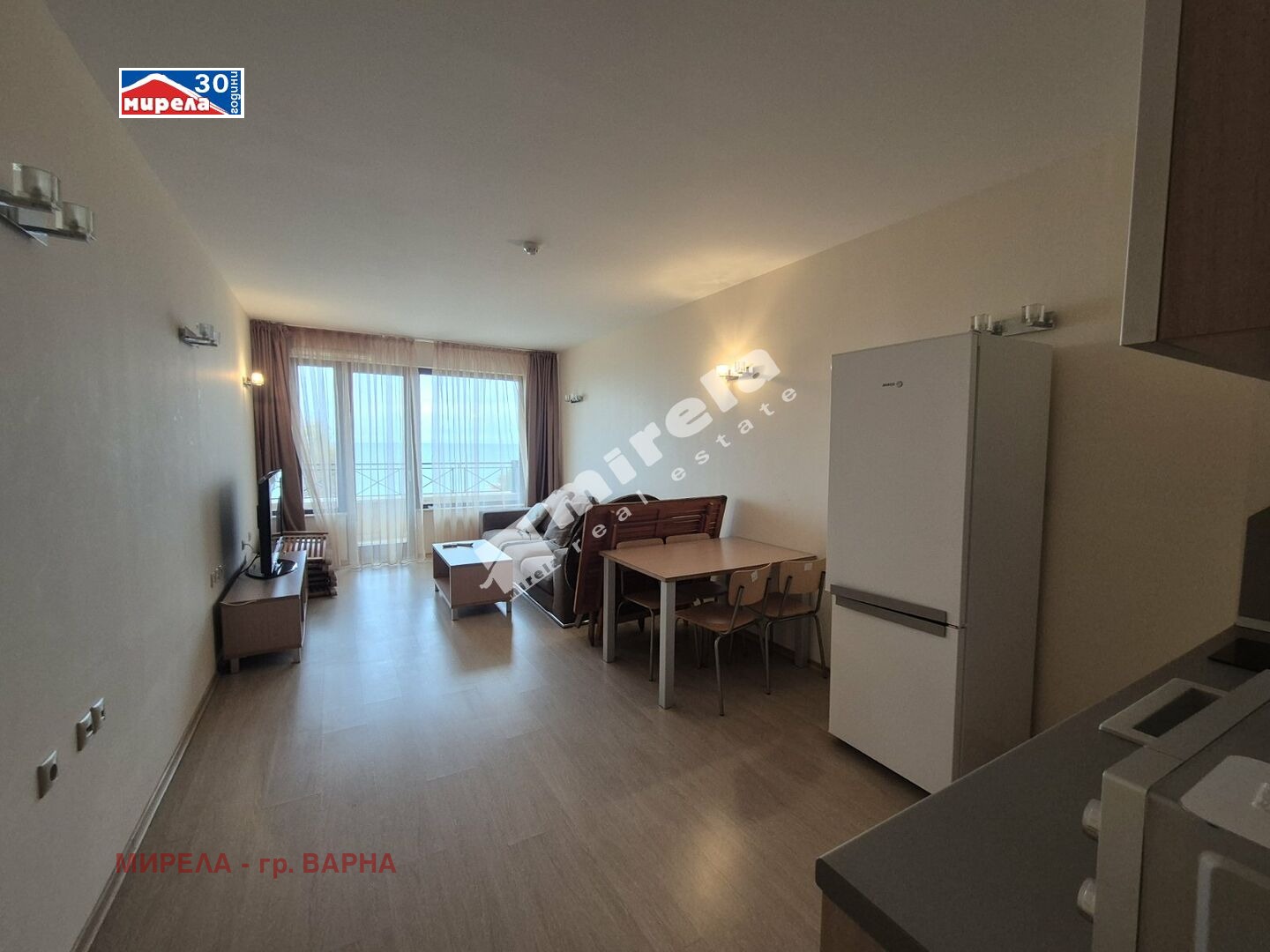 Дневна с кухненски бокс и излаз на тераса с изглед към морето