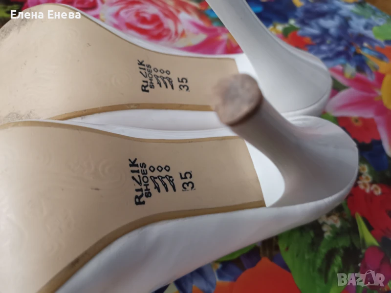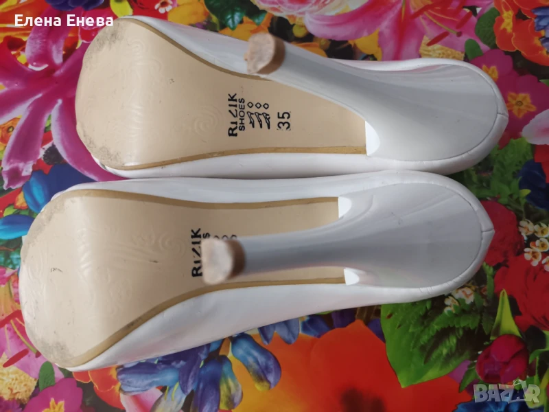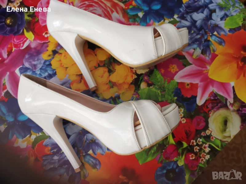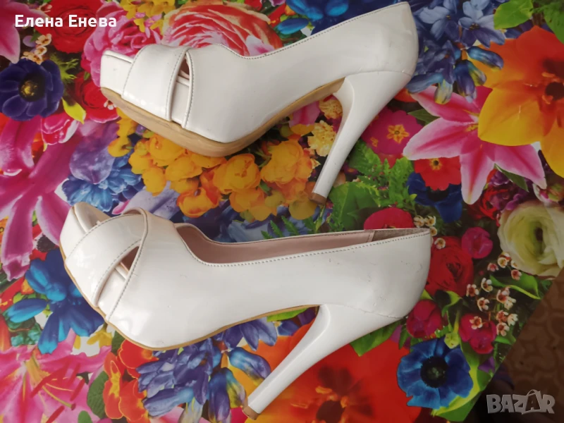 Изработени са от естествени качествени материали. Кожата е с лаково покритие. Бели на цвят. Размер 35. Височина на платформата 3 см., височина на тока 9 см. Иполвани са само веднъж.