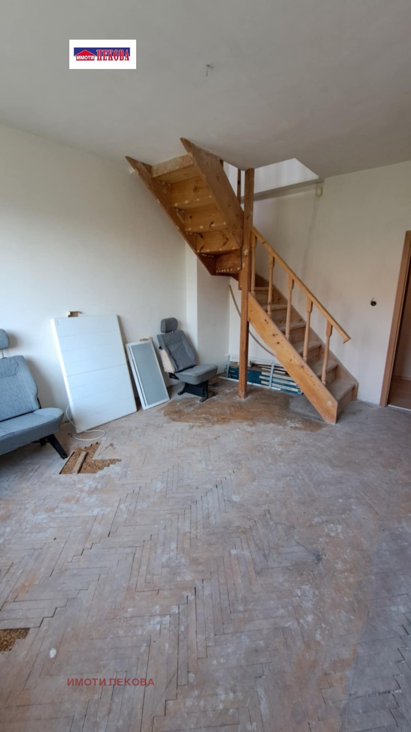 -Преустроен в жилище тип мезонет- на първо ниво кухня с остъклена тераса, просторен хол (бивш хол със спалня), спалня, от която се качва към второто ниво, обособено къто спалня (бивша таванска стая към апартамента), коридор, обща баня с тоалетна и мокро помещение;
