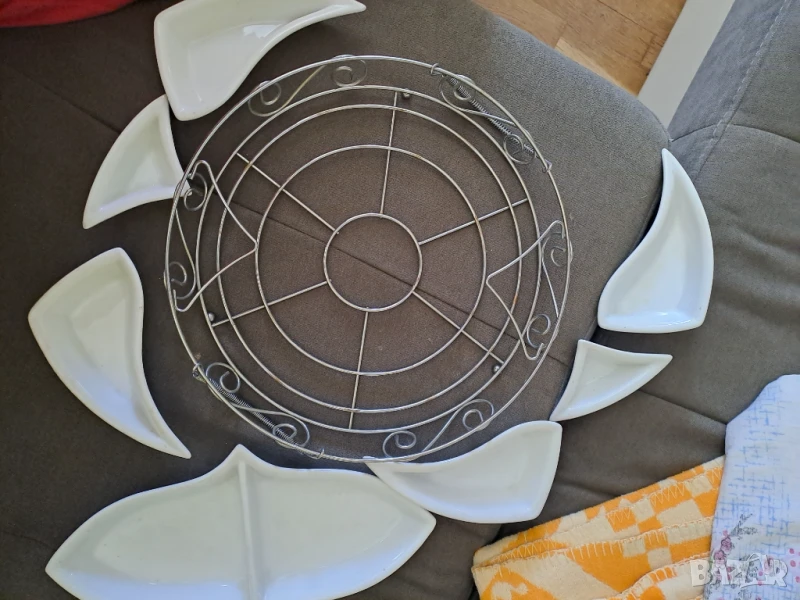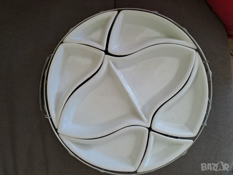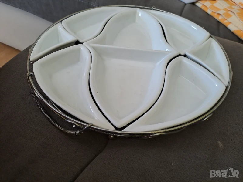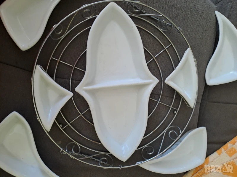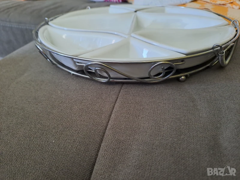 Луксозен порцеланов сет за ордьоври, разядки, ядки и др. върху метална орнаментна подложка. Комплекта е донесен от Италия и не е ползван. Отговарям на съобщения тук или т.0887780808, изпращам с куриер с преглед или лично предаване в София.